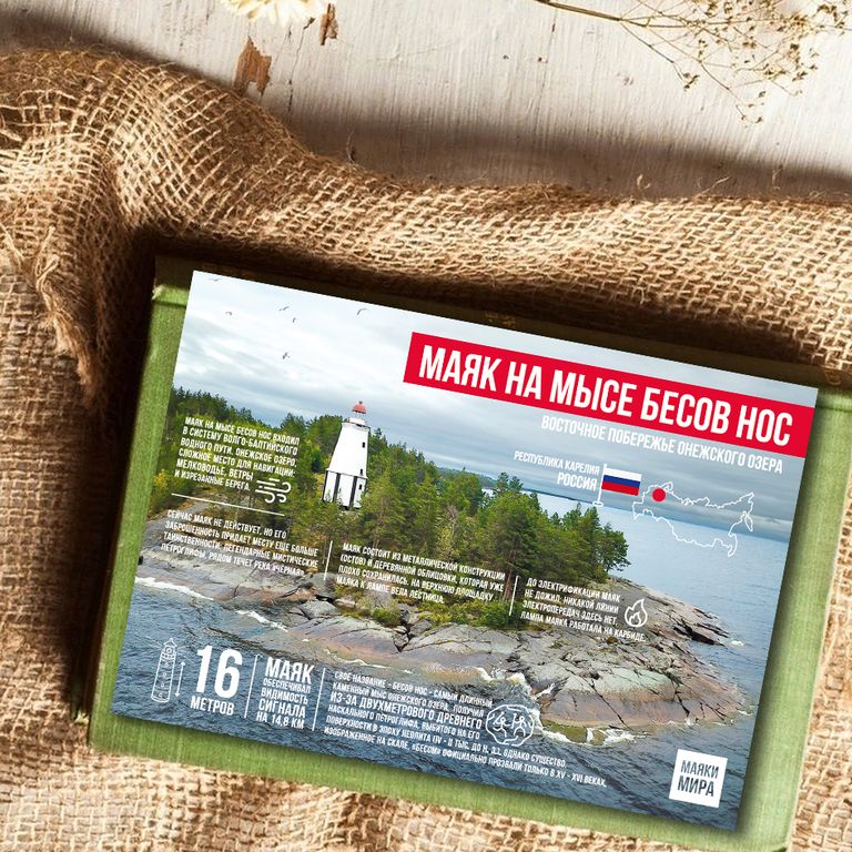(RU) Маяки мира. Россия. Маяк на мысе Бесов Нос 23 ₽ В корзину В корзину Формат: A6 (105 × 148 мм)Картон: 300 г/м2Оборот: не мелованныйМетод печати: офсетЛаминация: глянцевая (лицевая сторона)Дизайн "Postal Jack" Формат: A6 (105 × 148 мм)Картон: 300 г/м2Оборот: не мелованныйМетод печати: офсетЛаминация: глянцевая (лицевая сторона)Дизайн "Postal Jack" Поделиться