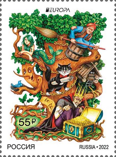 На почтовой марке изображены сказочные персонажи из произведения А.С. Пушкина «Руслан и Людмила».